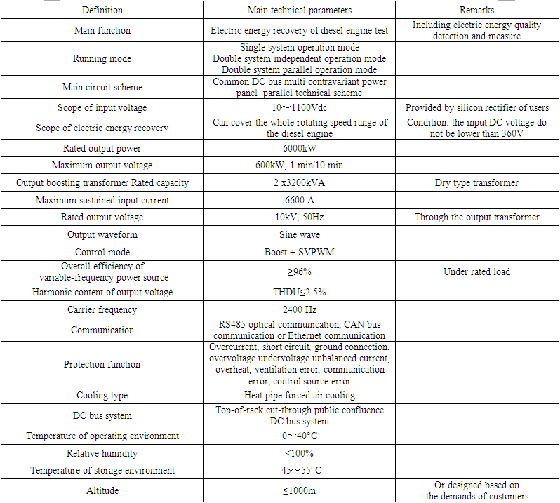 The 6000kW electric energy recovery equipment for diesel engine load test is the high-power 4Q recification researched and produced by our company to meet the electric energy recovery demands of diesel engine load tests. It adopts the “common DC bus multi contravariant power panel parallel technical scheme”, which has the characters like good performance, reliable functioning, compact structure, convenient use and preservation, etc., and it is the best choice for the electric energy recovery in high-power diesel engine load tests.