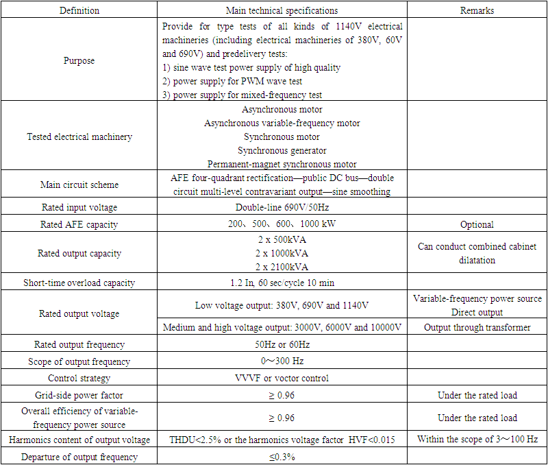 The 1140V series of static variable frequency power supplies for electric motor testing is the serialized products of variable frequency power supply developed by our company specially faced with the type tests for electromotors and electric generators and predelivery tests, which is broadly used in all kinds of tests of asynchronous motors, variable frequency motors, synchronous motors and permanent magnet synchronous motors. The products of this series adopt the AFE four-quadrant rectification, common DC buses, three-level inverter double line contravariant and combined sine filter technique, which can not only provide high-quality variable frequency power supply for all kinds of electrical motor tests including 380V, 690V (including 690V) and 1140V directly, but can also provide high-quality variable frequency power supply for all kinds of electrical motor tests including 3000V, 6000V and 10000V through the output transformer. For many years, with the support of vast customers, the 1140V series standardized electrical motor test static variable frequency power supply products of our company obtained the reputations from customers with the mature technology, advanced property, complete functions, good quality, compact structure, low price, convenient use and good service, etc., and have been broadly used in many fields including type tests of all kinds of electromotors and electric generators, predelivery tests and electrical machinery research and development.